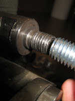 Viereisessä kuvassa vasemmalla lukitsimen M8 kierre ja sen vierellä M8 pultti vertailuksi. Onnekseni joku on tehnyt tuon lukitsimen vastakappaleen vissiinkin kiilateräksestä, joka on huomattavasti lujempaa kuin mistä tuo pultti oli tehty, joten sen kierre oli ehjät.